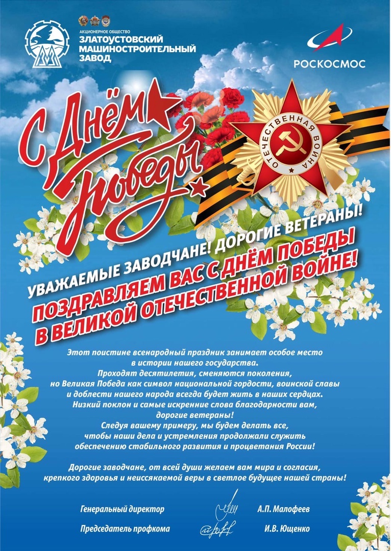 Поздравление с Днем Победы от генерального директора АО «Златмаш» Антона Малофеева и председателя профсоюзного комитета АО «Златмаш» Игоря Ющенко